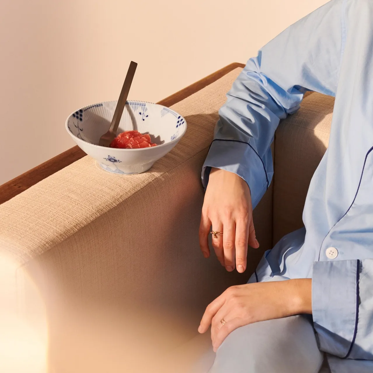 The small 78 cl Blue Elements Bowl lets loose in a playful combination of classic elements from Royal Copenhagen’s collections. The tactile flutes and iconic, jagged edge from Flora Danica are adorned by twirling flowers and palmettos, hand painted with an informal expression. The bowl makes for a playful table setting, and it is ideal for use as a cereal bowl or for servings of snacks and sides. The Blue Elements collection blooms in elegant joyfulness with an inspiring combination of classic Royal Copenhagen design elements and classic, hand painted decorations that grow freely across porcelain surfaces. Like White Elements and Multicoloured Elements, the collection shines on its own or in a combination with classic collections from Royal Copenhagen in a playful style of contemporary beauty.