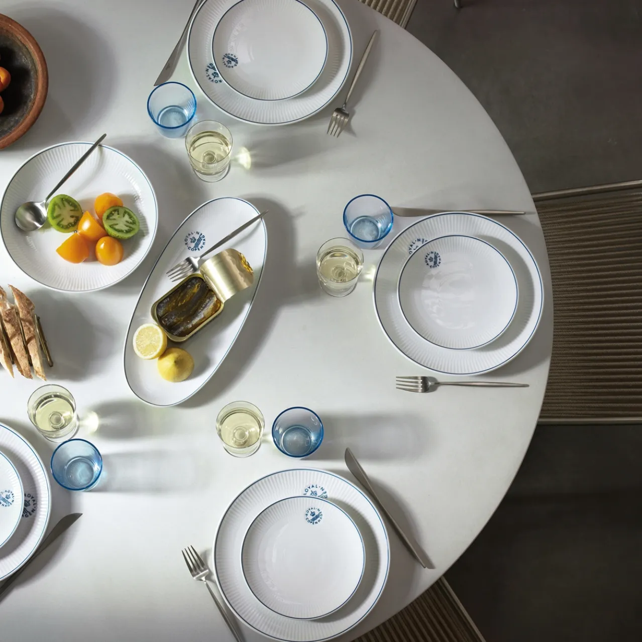 With the eye-catching logo stamp encircled by the hand painted blue line, the 27 cm plate in the Blueline collection invites you to create beautiful servings on the simplistic porcelain. In a staggered position from the center, near the rim of the plate, it emerges as a beautiful disturber of the well-known flutes. The smooth rounding of the coupe shape allow you to experiment with your servings and make use of every centimeter of the plate from the center to the fine blue line.