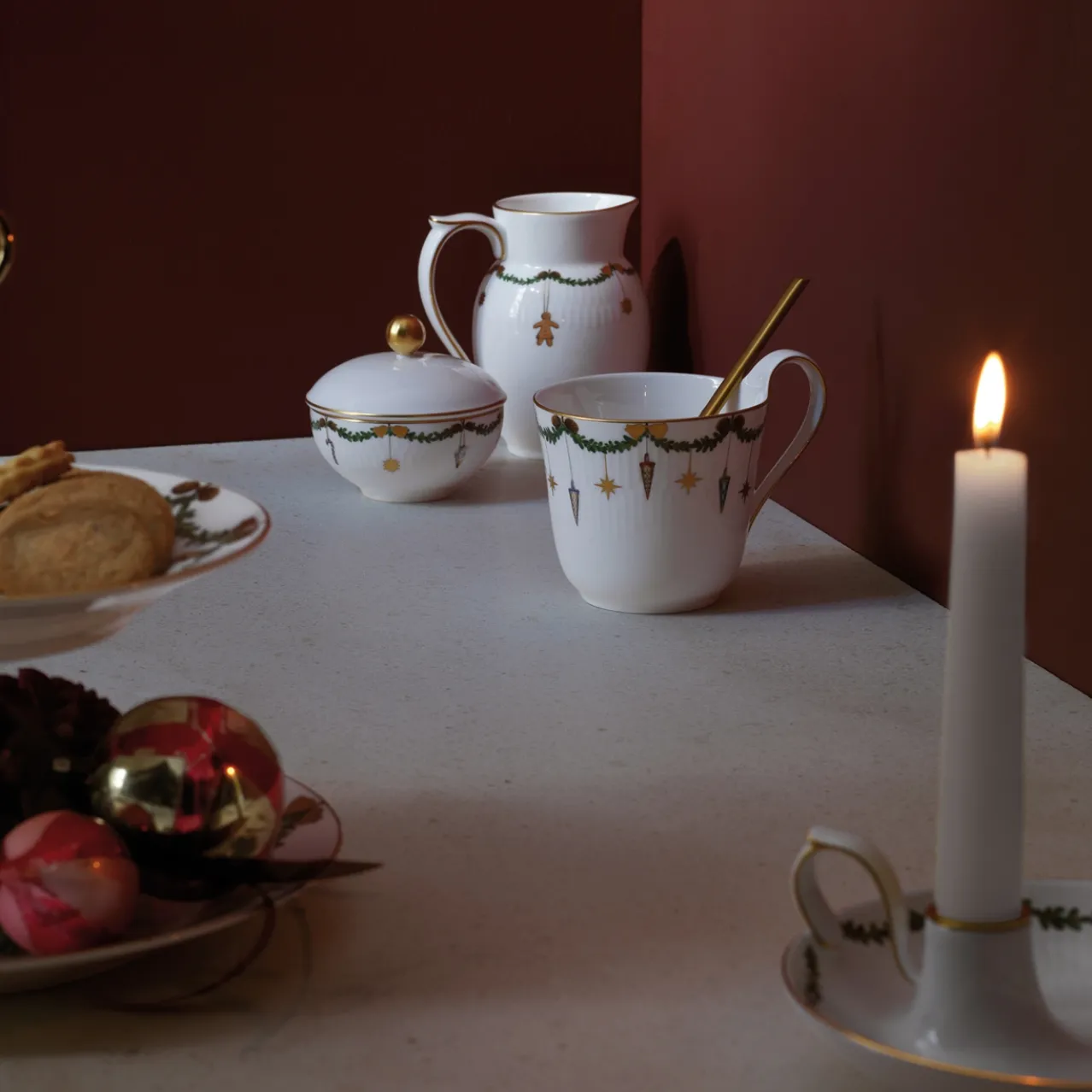 Adorned with gold details, a wreath of spruce and Christmas ornaments, this Star Fluted Christmas jug is an elegant addition to any table. The 39 cl jug is ideal for both cold and hot beverages, and it also functions as a cream jug or milk jug. Nothing encapsulates the spirit of the holidays quite like gathering around the table for cozy moments of joy and togetherness. This is where the beloved Christmas dinner service from Royal Copenhagen has come to life and become a part of many holiday traditions. The festive wreaths of spruce bordering the plates, bowls and cups are adorned with silk ribbon bows and Christmas decorations, creating a rich and elegant service, which is the perfect background for all your joyful holiday meals.